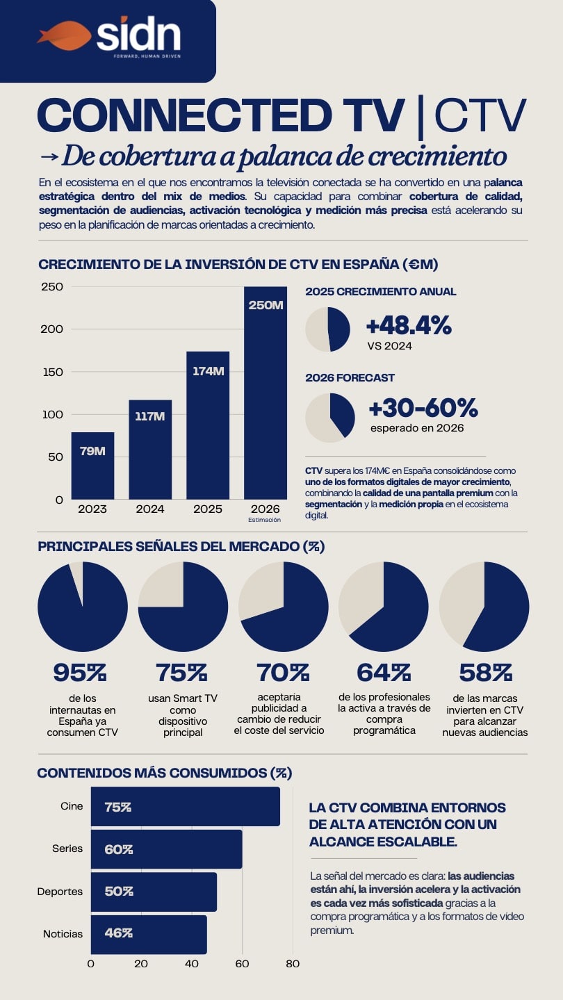 Los datos del mercado son claros: la inversión en CTV en España ha experimentado un crecimiento sostenido, pasando de 79M€ en 2023 a 174M€ en 2025, con previsión de alcanzar los 250M€ en 2026.